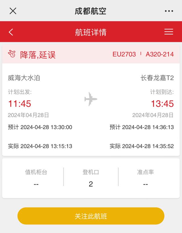 潇湘晨报记者通过成都航空官微查询发现航班动态,4月28日从威海大水泊机场飞往长春龙嘉机场的EU2703航班显示为降落延误。计划出发时间为11点45分,计划到达时间为13点45分,实际上13点15分出发,14点35分到达。延误原因并没有标注。