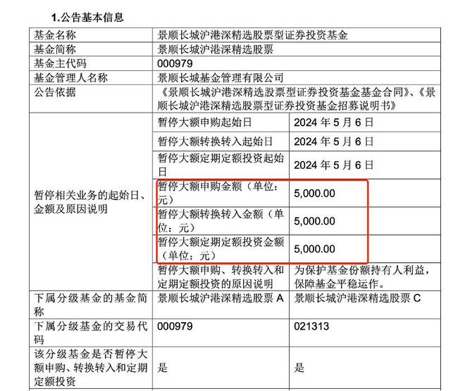鲍无可管理的景顺长城沪港深精选等3只基金今日公告称,为保护基金份额持有人利益,保障基金平稳运作,自五一节后,也就是5月6日开始,基金暂停大额申购,包括转换转入、定投等所有买入。
