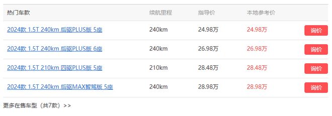 汽车专业网站易车的数据显示,问界M7(2024款)目前有后驱Plus五座、后驱Plus六座、后驱Max五座、后驱Max六座、四驱Plus五座、四驱Max五座、四驱Max六座共七款车型。且只有后驱Plus五座的指导价低于25万元。