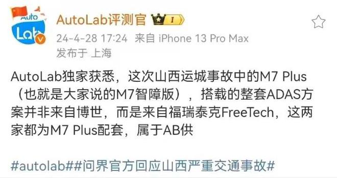 同时,一个认证为“AutoLab评测官”的大V表示,Autolab独家获悉,这次山西运城事故中的M7 Plus(也就是大家说的M7智障版),搭载的整套ADAS方案并非来自博世,而是来自福瑞泰克FreeTech,这两家都为M7配套,属于AB供。