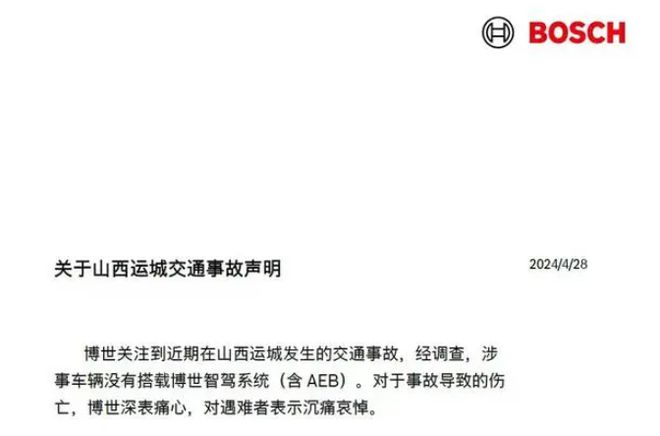 但随后,博世发布《关于山西运城交通事故声明》称,博世关注到近期在山西运城发生的交通事故,经调查,涉事车辆没有搭载博世智驾系统(含AEB)。对于事故导致的伤亡,博世深表痛心,对遇难者表示沉痛哀悼。