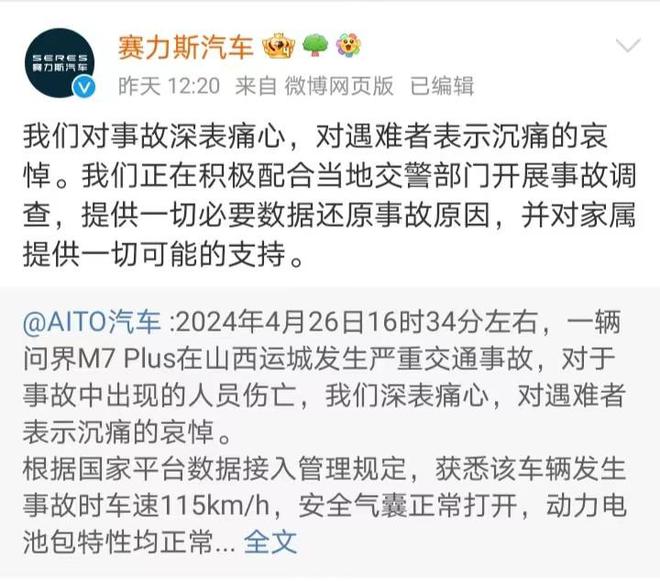 随后,赛力斯汽车官方微博转发AITO汽车的微博称,我们对事故深表痛心,对遇难者表示沉痛的哀悼。我们正在积极配合当地交警部门开展事故调查,提供一切必要数据还原事故原因,并对家属提供一切可能的支持。