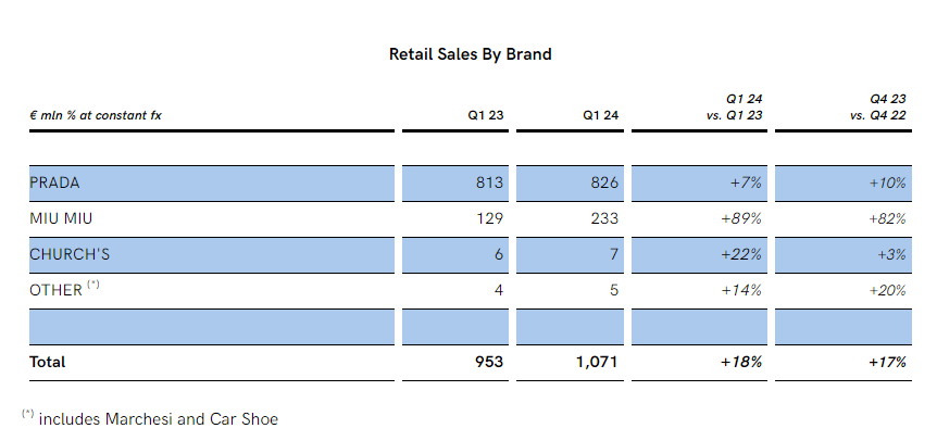 “疯狂”的Miu Miu助推了母公司业绩。Miu Miu母公司普拉达(01913.HK,股价63.8港元,市值1633亿港元)2024年第一季度财报显示,普拉达集团收益净额约为11.87亿欧元,较2023年同期增加16.5%:Prada品牌的零售销售净额增加7%,Miu Miu零售销售净额增加高达89%。