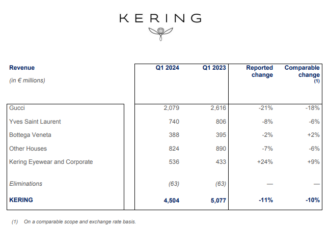 今年一季度,LVMH集团销售额同比下降2%至207亿欧元,其中LV和Dior所在的时装皮具部门收入下跌2%至104.9亿欧元,为近两年来最差表现。而从销售区域来看,亚洲市场(不包括日本)的销售收入同比下降6%,对LVMH集团的销售贡献由36%降至33%。而开云集团今年一季度的收入则较上年同期下降10%(在可比基础上)至45亿欧元,其中Gucci的收入同比下降18%至21亿欧元,该品牌在亚太地区的销售额同比下滑28%。