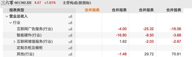 报告期内,公司互联网商业化及增值服务共实现收入56.20 亿元,同比下降 2.95%,主要因互联网广告及服务业务同比下降 4.00%,该部分业务2022年同比下降25.32%,2021年同比下降16.06%。而三六零安全及其他相关收入17.65 亿元,同比降1.48%,智能硬件业务报告期内营业收入15.70 亿元,同比下降 16.80%。