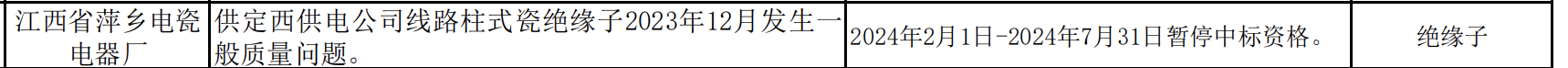 其中,江西省萍乡电瓷电器厂,供定西供电公司线路柱式瓷绝缘子2023年12月发生一般质量问题。被国网甘肃于2024年2月1日-2024年7月31日暂停中标资格。 处理范围为,绝缘子。特别指出,供应商整改合格且处理到期,处理自动解除。