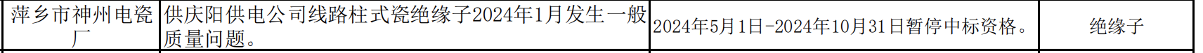 其中,萍乡市神州电瓷厂,供庆阳供电公司线路柱式瓷绝缘子2024年1月发生一般质量问题。被国网甘肃于2024年5月1日-2024年10月31日暂停中标资格。 处理范围为,绝缘子。特别指出,供应商整改合格且处理到期,处理自动解除。