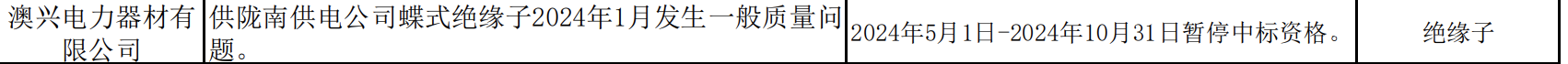 其中,澳兴电力器材有限公司,供陇南供电公司蝶式绝缘子2024年1月发生一般质量问题。被国网甘肃于2024年5月1日-2024年10月31日暂停中标资格。 处理范围为,绝缘子。特别指出,供应商整改合格且处理到期,处理自动解除。