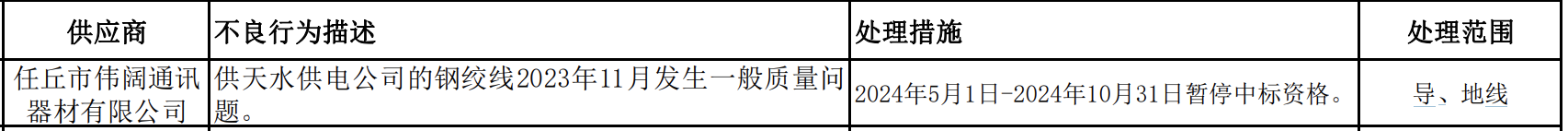 其中,任丘市伟阔通讯器材有限公司,供天水供电公司的钢绞线2023年11月发生一般质量问题。被国网甘肃于2024年5月1日-2024年10月31日暂停中标资格。 处理范围为,导、地线。特别指出,供应商整改合格且处理到期,处理自动解除。