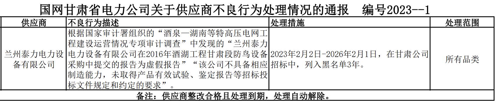 其中,兰州泰力电力设备有限公司,根据国家审计署组织的“酒泉—湖南等特高压电网工程建设运营情况专项审计调查”中发现的“兰州泰力电力设备有限公司在2016年酒湖工程甘肃段防鸟设备采购中提交的报告为虚假报告”“该公司不具备相应制造能力,未取得产品有效试验、鉴定报告等招标投标文件规定和约定的要求”,被国网甘肃省电力公司于2023年2月2日-2026年2月1日,在甘肃公司招标中,列入黑名单3年。 处理范围为,所有品类。特别指出,供应商整改合格且处理到期,处理自动解除。