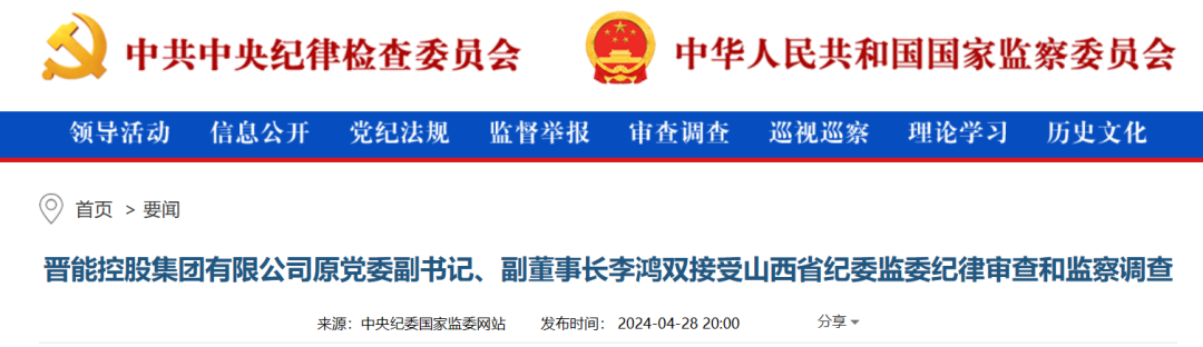 据澎湃新闻:4月28日晚,中央纪委国家监委网站援引山西省纪委监委消息通报称:晋能控股集团有限公司(简称“晋能控股集团”)原党委副书记、副董事长李鸿双涉嫌严重违纪违法,目前正接受山西省纪委监委纪律审查和监察调查。