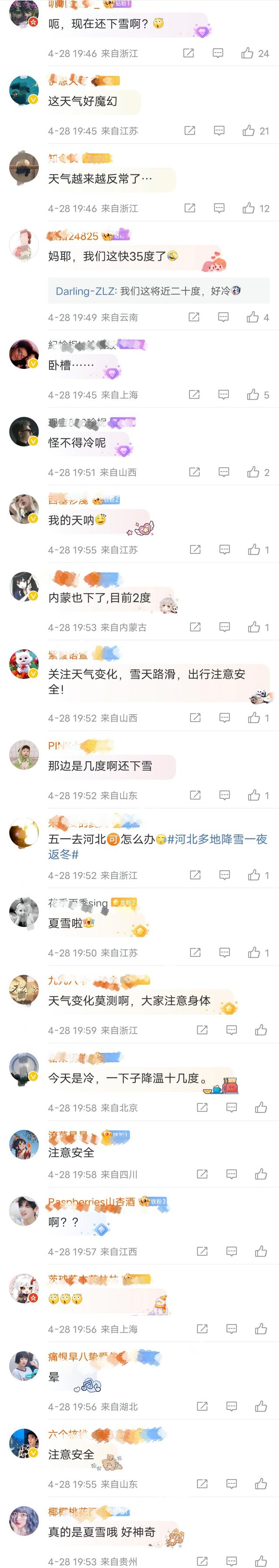 昨晚(4月27日)起,河北多地出现降雪。在承德塞罕坝机械林场,截至今天11点,雪深达到32厘米;张家口的塞北管理区,出行的居民换回了冬装。