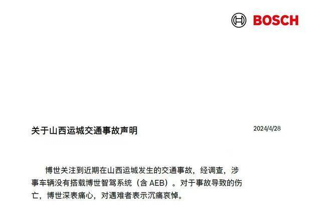 4月28日消息,博世针对问界M7山西运城事故发布声明,称博世关注到近期在山西运城发生的交通事故,经调查,涉事车辆没有搭载博世智驾系统(含AEB)。对于事故导致的伤亡,博世深表痛心,对遇难者表示沉痛哀悼。