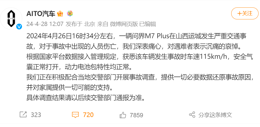 4月28日中午,AITO汽车官方微博回应称,2024年4月26日16时34分左右,一辆问界M7 Plus在山西运城发生严重交通事故,对于事故中出现的人员伤亡,我们深表痛心,对遇难者表示沉痛的哀悼。