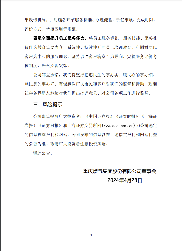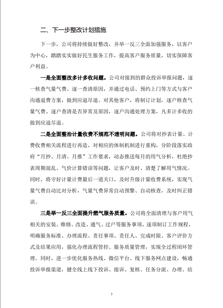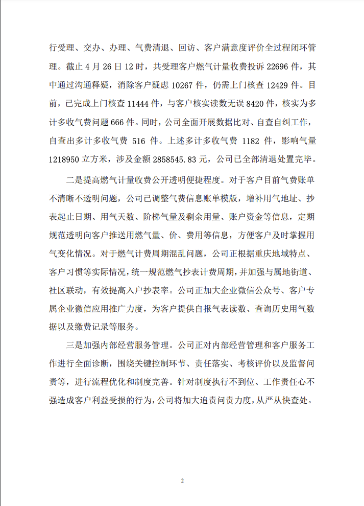 4月28日,重庆燃气集团股份有限公司发布关于对重庆市燃气领域群众反映问题联合调查组调查结果整改情况的公告:近期,重庆市燃气领域群众反映问题联合调查组就相关问题发布了调查结果,对此我们全面接受。对于联合调查组在调查结果中指出燃气企业存在的错抄和违规估抄、燃气计费周期混乱、价格政策执行不到位、换表工作组织无序、工作力量严重不足以及内部监督管理不到位等问题,公司深刻反思、深感自责。据统计,多计多收气费1182件,影响气量1218950立方米,涉及金额2858545.83元,公司已全部清退处置完毕。下一步将全面整改多计多收问题,全面整治计量收费不规范不透明问题,举一反三全面提升燃气服务质量。