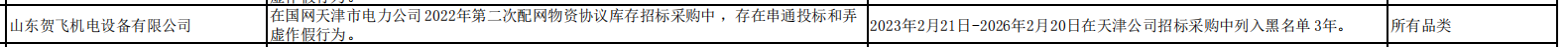 公告显示,山东贺飞机电设备有限公司,在国网天津市电力公司2022年第二次配网物资协议库存招标采购中 ,存在串通投标和弄虚作假行为。
