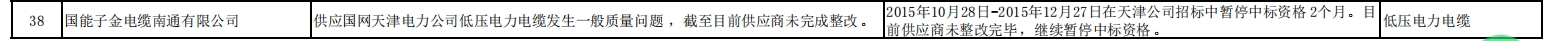 公告显示,国能子金电缆南通有限公司供应国网天津电力公司低压电力电缆,发生一般质量问题,截至目前供应商未完成整改。相关处理措施为,2015年10月28日-2015年12月27日在天津公司招标中暂停中标资格2个月。目前供应商未整改完毕,继续暂停中标资格。处理范围为,低压电力电缆。