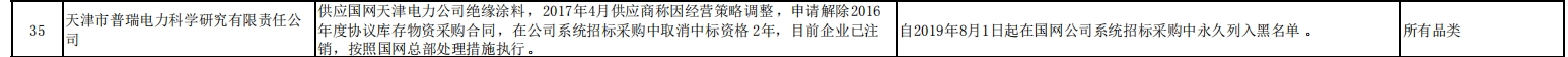 公告显示,天津市普瑞电力科学研究有限责任公司供应国网天津电力公司绝缘涂料 ,2017年4月供应商称因经营策略调整 ,申请解除2016 年度协议库存物资采购合同,在公司系统招标采购中取消中标资格 2年,目前企业已注销,按照国网总部处理措施执行。相关处理措施为,自2019年8月1日起在国网公司系统招标采购中永久列入黑名单。处理范围为,所有品类。