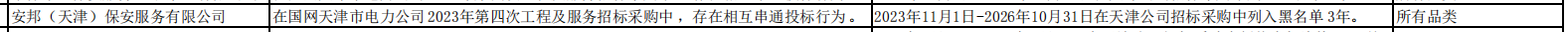 公告显示,安邦(天津)保安服务有限公司,在国网天津市电力公司2023年第四次工程及服务招标采购中 ,存在相互串通投标行为。