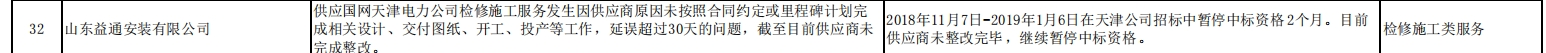 公告显示,山东益通安装有限公司供应国网天津电力公司检修施工服务,发生因供应商原因未按照合同约定或里程碑计划完成相关设计、交付图纸、开工、投产等工作,延误超过30天的问题,截至目前供应商未完成整改。相关处理措施为,2018年11月7日-2019年1月6日在天津公司招标中暂停中标资格2个月。目前供应商未整改完毕,继续暂停中标资格。处理范围为,检修施工类服务。