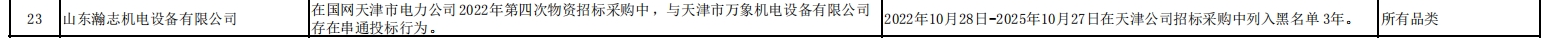 公告显示,山东瀚志机电设备有限公司在国网天津市电力公司2022年第四次物资招标采购中,与天津市万象机电设备有限公司存在串通投标行为。相关处理措施为,2022年10月28日-2025年10月27日在天津公司招标采购中列入黑名单3年。处理范围为,所有品类。