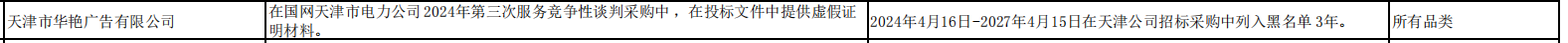 公告显示,天津市华艳广告有限公司,在国网天津市电力公司2024年第三次服务竞争性谈判采购中 ,在投标文件中提供虚假证明材料。