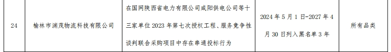 公告显示,榆林市渊茂物流科技有限公司在国网陕西省电力有限公司咸阳供电公司等十三家单位2023年第七次授权工程、服务竞争性谈判联合采购项目中存在串通投标行为。相关处理措施为,2024年5月1日-2027年4月30日列入黑名单3年。处理范围为,所有品类。