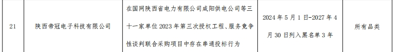公告显示,陕西帝冠电子科技有限公司在国网陕西省电力有限公司咸阳供电公司等三十一家单位2023年第三次授权工程、服务竞争性谈判联合采购项目中存在串通投标行为。相关处理措施为,2024年5月1日-2027年4月30日列入黑名单3年。处理范围为,所有品类。