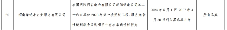 公告显示,渭南臻达丰企业服务有限公司在国网陕西省电力有限公司咸阳供电公司等二十六家单位2023年第一次授权工程、服务竞争性谈判联合采购项目中存在串通投标行为。相关处理措施为,2024年5月1日-2027年4月30日列入黑名单3年。处理范围为,所有品类。