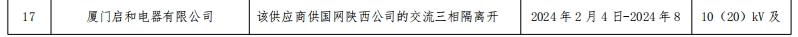 公告显示,厦门启和电器有限公司供国网陕西公司的交流三相隔离开关,2023年7月抽检发现III级质量问题,积1分。相关处理措施为,2024年2月4日-2024年8月3日暂停中标资格6个月。处理范围为,10(20)kV及以下隔离开关。