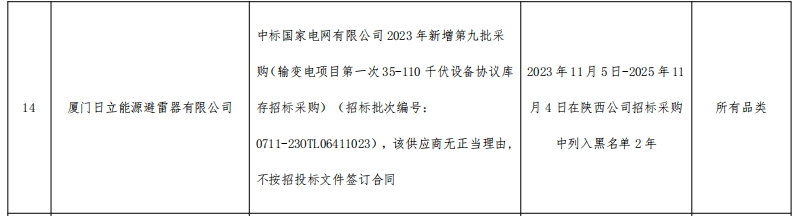 公告显示,厦门日立能源避雷器有限公司中标国家电网有限公司 2023 年新增第九批采购(输变电项目第一次 35-110 千伏设备协议库存招标采购)(招标批次编号:0711-23OTL06411023),该供应商无正当理由, 不按招投标文件签订合同。相关处理措施为,2023 年 11 月 5 日-2025 年 11月 4 日在陕西公司招标采购中列入黑名单 2 年。处理范围为,所有品类。