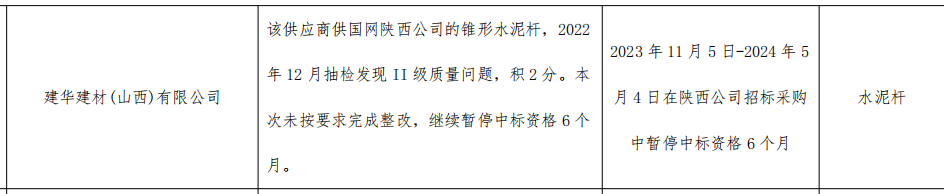 公告显示,建华建材(山西)有限公司,该供应商供国网陕西公司的锥形水泥杆,2022 年 12 月抽检发现 II 级质量问题,积2分。本次未按要求完成整改,继续暂停中标资格 6个月。