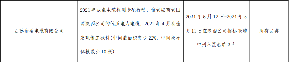 公告显示,江苏金圣电缆有限公司,在2021年成盘电缆检测专项行动中,该供应商供国网陕西公司的低压电力电缆,2021年4月抽检发现偷工减料(中间截面积变少22%、中间段导体根数少10根)。