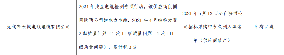 公告显示,无锡市长城电线电缆有限公司,在2021年成盘电缆检测专项行动,该供应商供国网陕西公司的电力电缆,2021 年 4 月抽检发现2起质量问题(1 次 II 级质量问题、1 次 III 级质量问题),累计积 3 分。