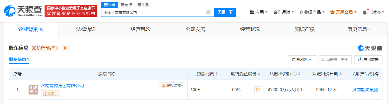 天眼查App显示,近日,济南大数据有限公司成立,法定代表人为潘世英,注册资本5亿人民币,经营范围含大数据服务、数字技术服务、智能控制系统集成、数据处理和存储支持服务等。股东信息显示,该公司由济南能源集团有限公司全资持股,后者为济南市人民政府国有资产监督管理委员会全资子公司。