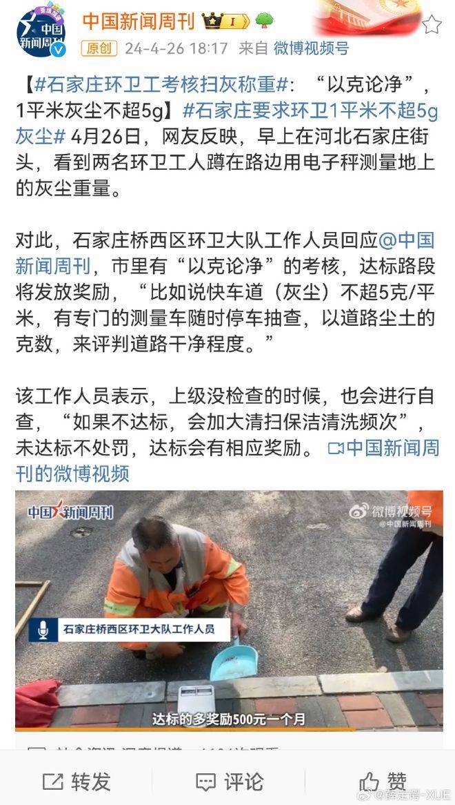 对此,石家庄桥西区环卫大队工作人员回应:市里有“以克论净”的考核,达标路段将发放奖励,“比如说快车道(灰尘)不超5克/平方米,有专门的测量车随时停车抽查,以道路尘土的克数,来评判道路干净程度。”