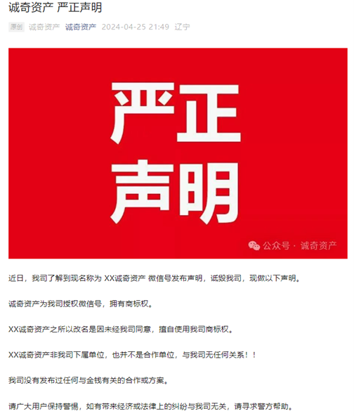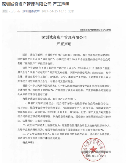 诚奇资产严正声明称:“上述微信平台公众号并非公司官方微信公众号,与公司无任何关系。”