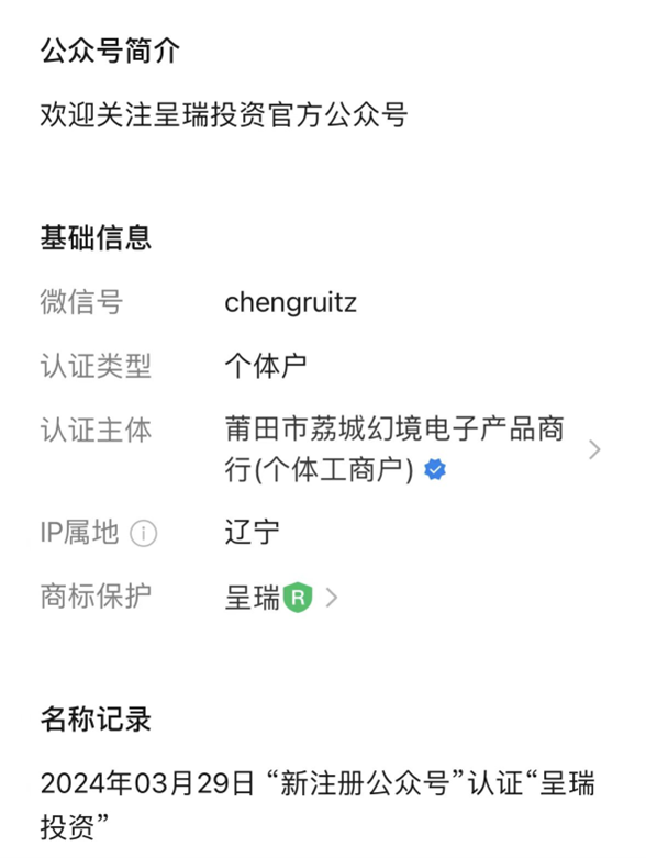 再如呈瑞投资,也被莆田市荔城幻境电子产品商行的个体工商户将新注册的公众号名称改为“呈瑞投资”,公众号简介为:“欢迎关注呈瑞投资官方公众号”,不仅如此,还申请了对“呈瑞”的商标保护,商标有效期至2028年4月6日。