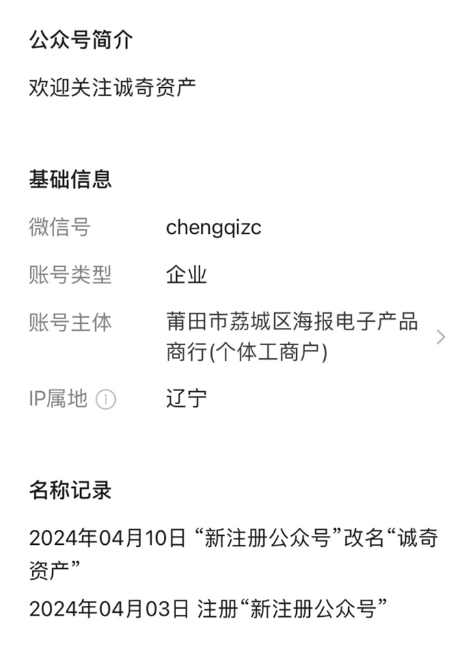 记者翻阅发现,诚奇资产于2019年11月7日在公众号系统注册了“诚奇资产”,由于该公司主体未认证,且诚奇资产被冒用名称,前段时间被系统命名为“未命名公众号”,4月25日,诚奇资产“被迫”改名为“深圳诚奇资产”并加v认证。