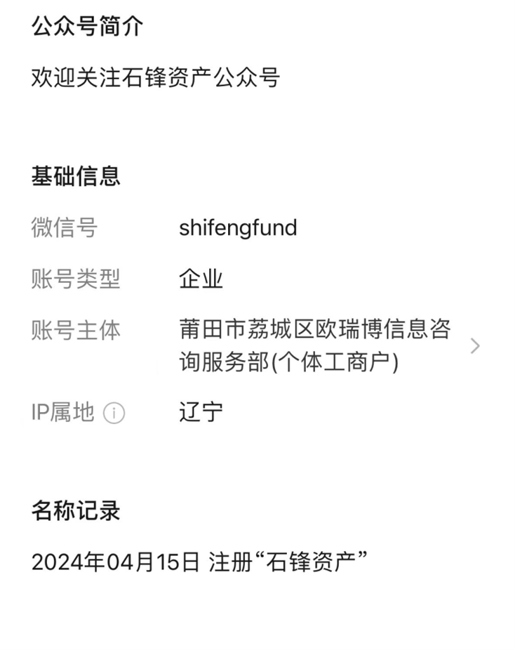 被个体工商户“坑”的还有石锋资产,4月中旬,一家名为莆田市荔城区欧瑞博信息咨询服务部的个体工商户注册了“石锋资产”,该公众号如出一辙地改为“欢迎关注石锋资产公众号”,同样发布了多条私募相关的文章。4月22日,石锋资产主体经营的公众号改名并认证为“上海石锋资产管理有限公司”。