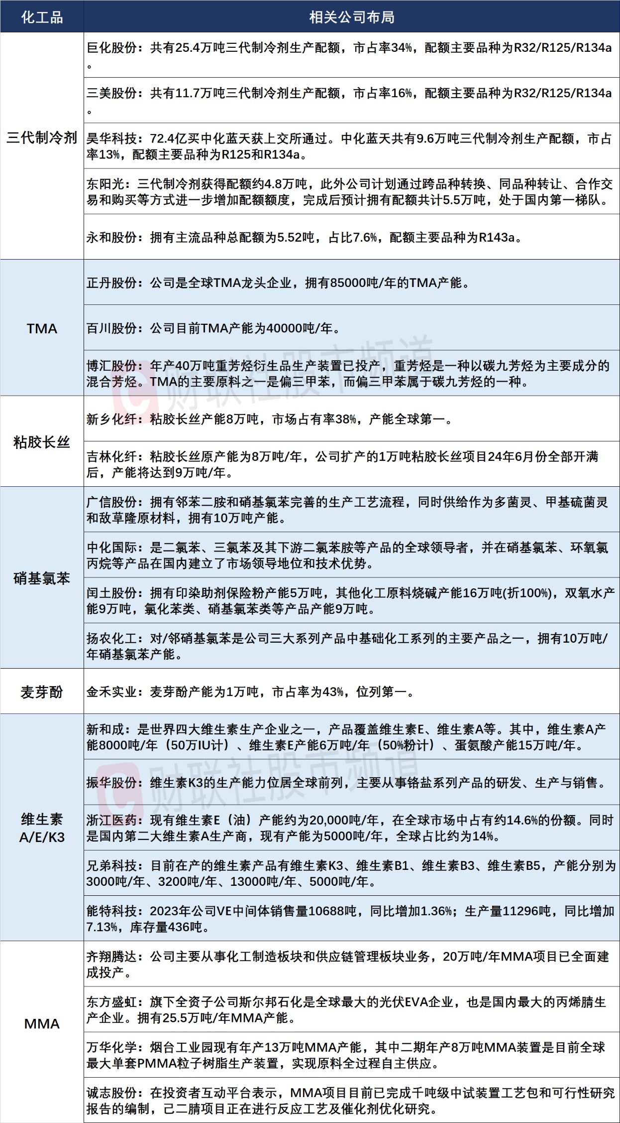 对此,中信证券总结了2024Q1以来价格相较成本实现超额增长的化工品种,包括制冷剂(生产配额+需求改善,YTD+60~75%)、粘胶长丝(短期无新增产能+需求旺盛,YTD+2.4%)、TMA(海外大厂关停,YTD+66.7%)、维生素(行业检修,YTD+10~20%)、硝基氯苯(短期无新增产能+格局集中,YTD+5~45%)、MMA(行业检修,YTD+16.8%)、麦芽酚(YTD+30~60%)等等。据财联社梳理,涉及上述化工品的公司具体情况如图: