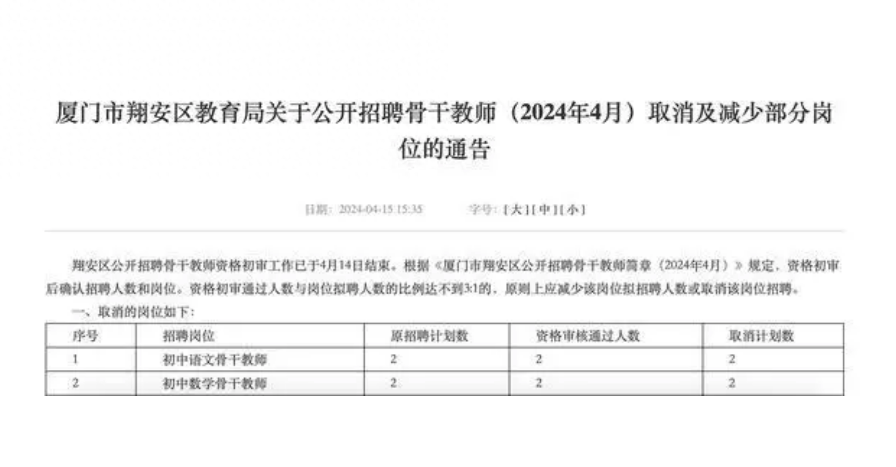 厦门市翔安区教育局发布的一则《关于公开招聘骨干教师(2024年4月)取消及减少部分岗位的通告》,引发不少讨论。