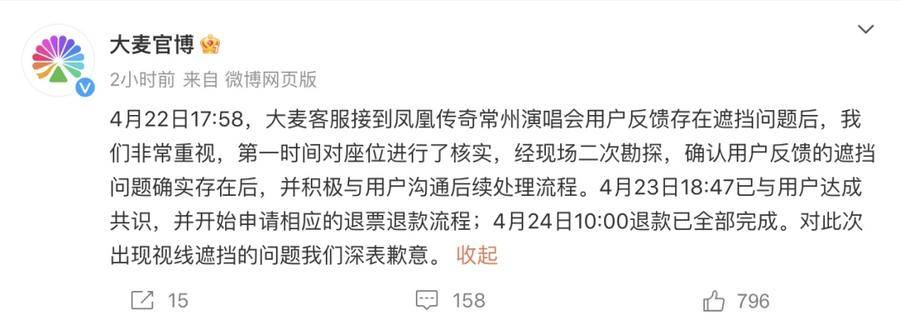 4月24日,大麦网回应称,用户反馈的问题确实存在,24日退款已全部完成,并对出现的视线遮挡问题表达了歉意。