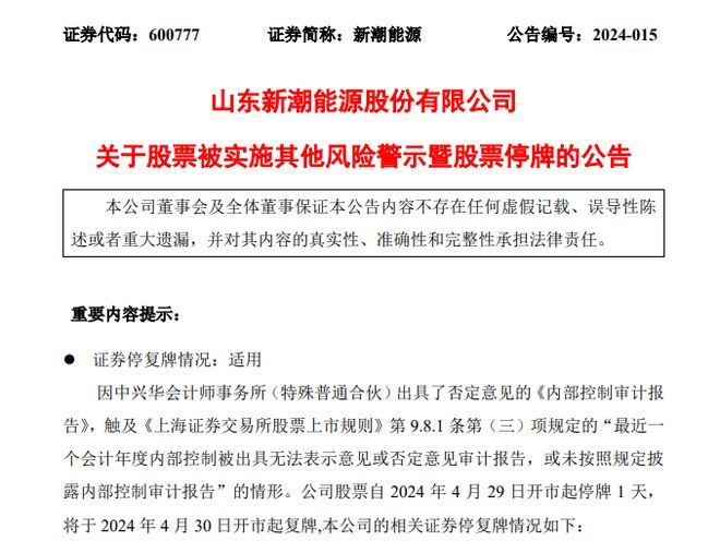 由于中兴华所的这一否定意见,新潮能源触及了《上海证券交易所股票上市规则》第9.8.1条第(三)项规定的“最近一个会计年度内部控制被出具无法表示意见或否定意见审计报告,或未按照规定披露内部控制审计报告”的情形。因此新潮能源股票将自4月29日开市起停牌1天,将于4月30日开市起复牌,且股票简称将变更为ST新潮。
