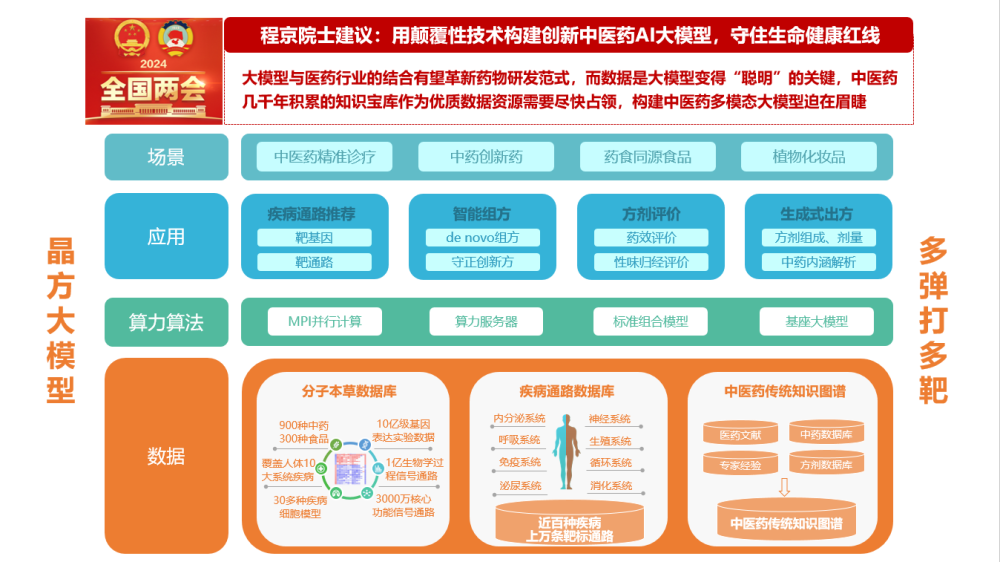 中国工程院院士、清华大学生物医学工程学院讲席教授程京表示:“在今年全国两会上,我建议要尽快设立重大专项,尤其是基于北京市在AI和中医药领域的资源优势,支持大学和企业联合开展‘用颠覆性技术构建中医药AI大模型’重大系统化工程,守住中国人生命健康红线。”