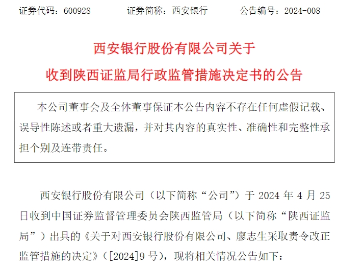 西安银行公告披露,公司于2024年4月25日收到中国证券监督管理委员会陕西监管局(以下简称“陕西证监局”)出具的《关于对西安银行股份有限公司、廖志生采取责令改正监管措施的决定》。