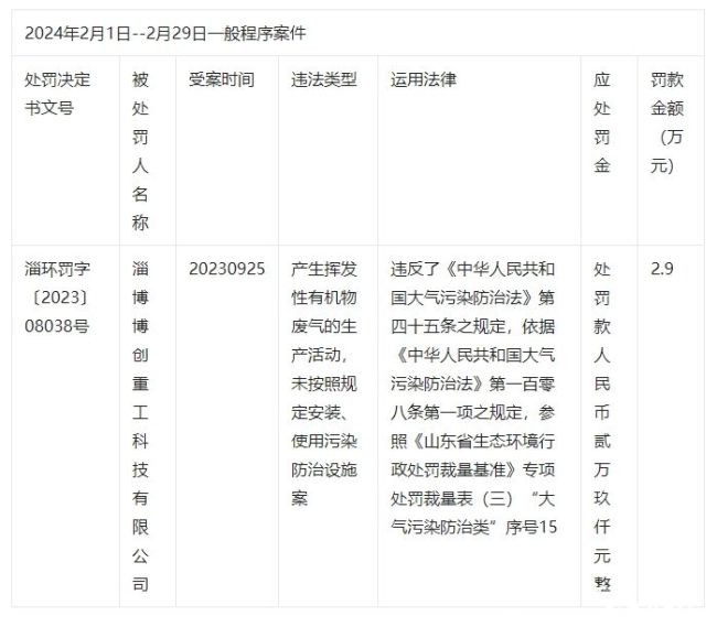山东淄博市生态环境局桓台分局近日发布行政处罚信息,信息显示,淄博博创重工科技有限公司因违反大气污染防治法相关规定被罚2.9万元。处罚信息如下: