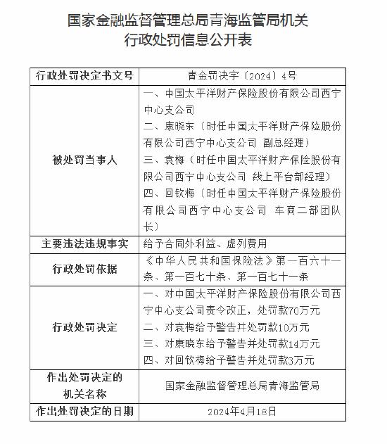国家金融监督管理总局网站发布的行政处罚信息公开表显示,中国太平洋财产保险股份有限公司西宁中心支公司因给予合同外利益、虚列费用,被青海监管局责令改正并罚款70万元。