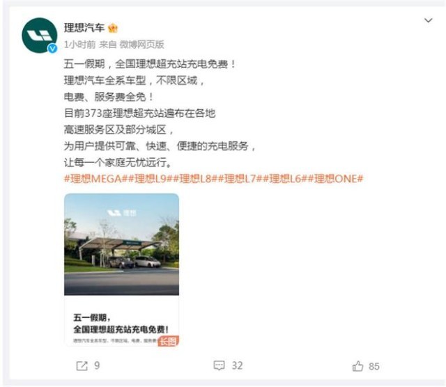据鲁中晨报报道,理想汽车官微4月25日消息,五一假期,全国理想超充站充电免费!理想汽车全系车型,不限区域,电费、服务费全免!目前373座理想超充站遍布在各地、高速服务区及部分城区。