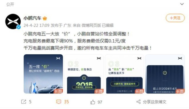 另外,小鹏汽车官微也曾于4月22日发布消息:小鹏充电五一大放“价”,小鹏自营站价格全面调整!充电服务费最高下调90%,服务费最低仅需0.1元/度。